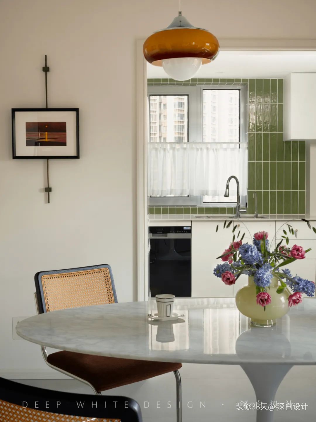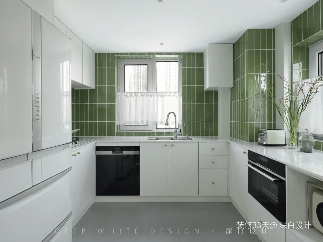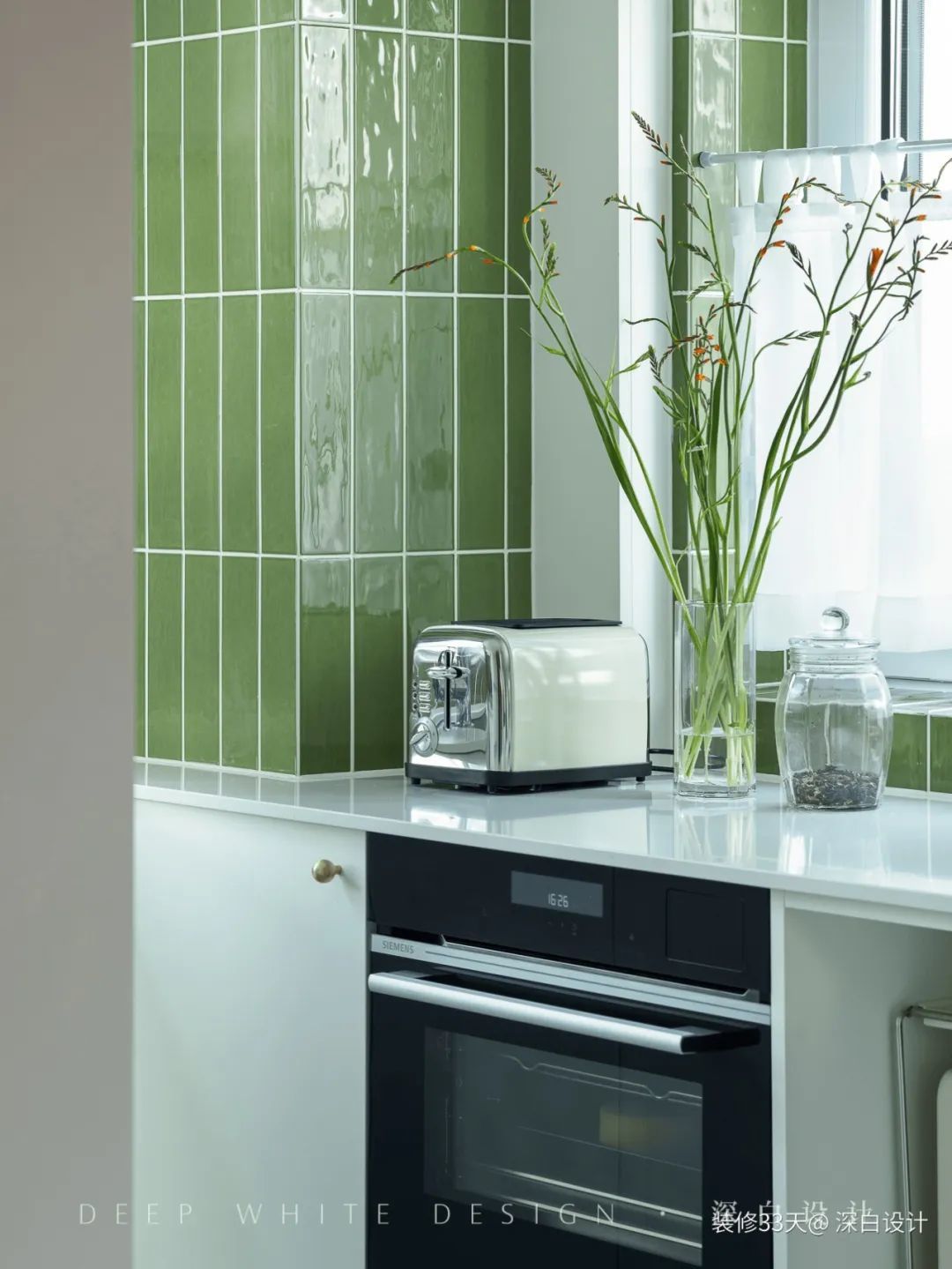 ▲ 厨房主要是采用了白色和绿色的配色方案,营造出一个既纯净又具有复古风情的烹饪空间。墙面上贴着的绿色方形小砖,既是对经典复古风格的致敬,也为整体空间带来了一抹自然的清新气息
