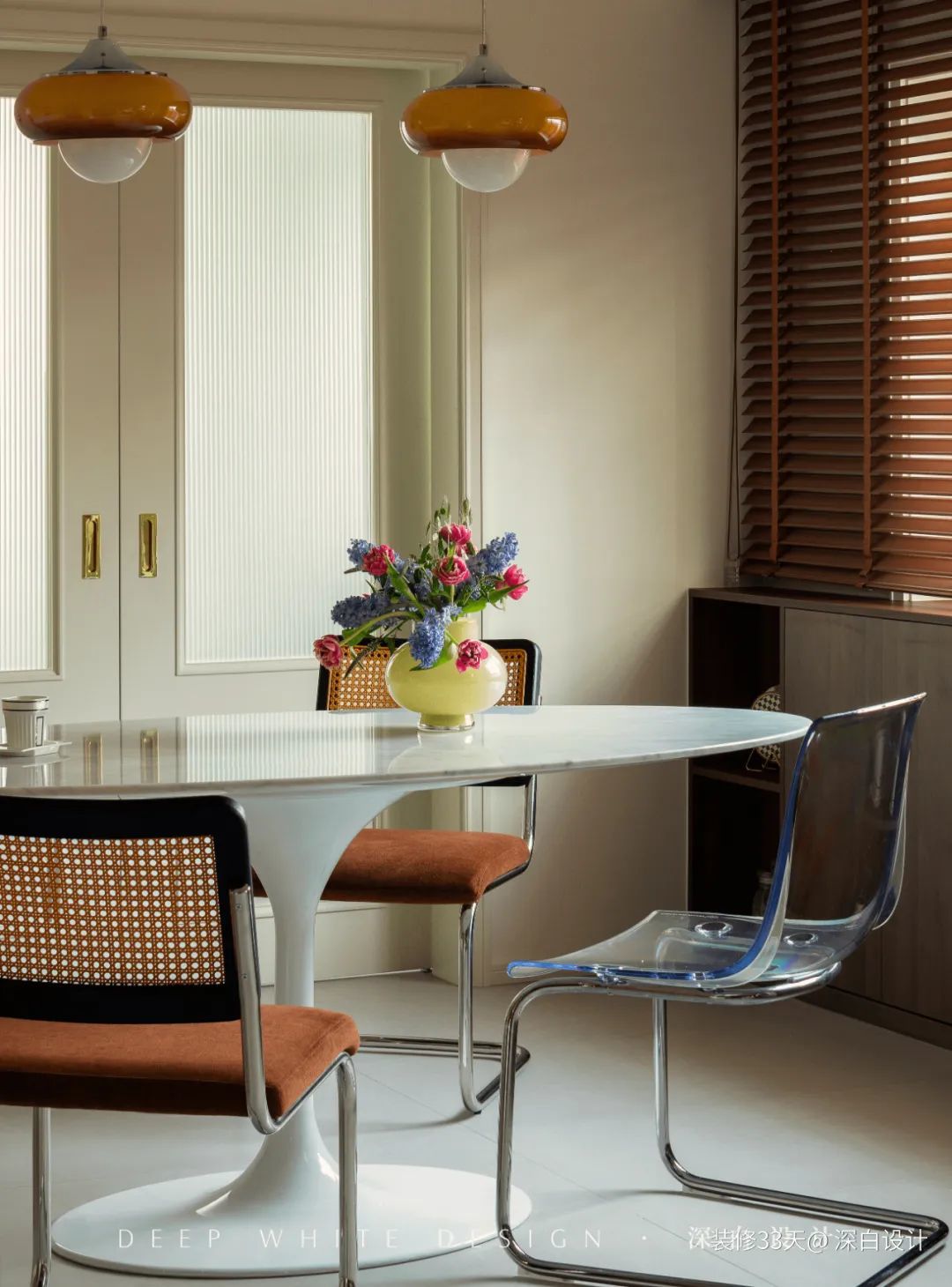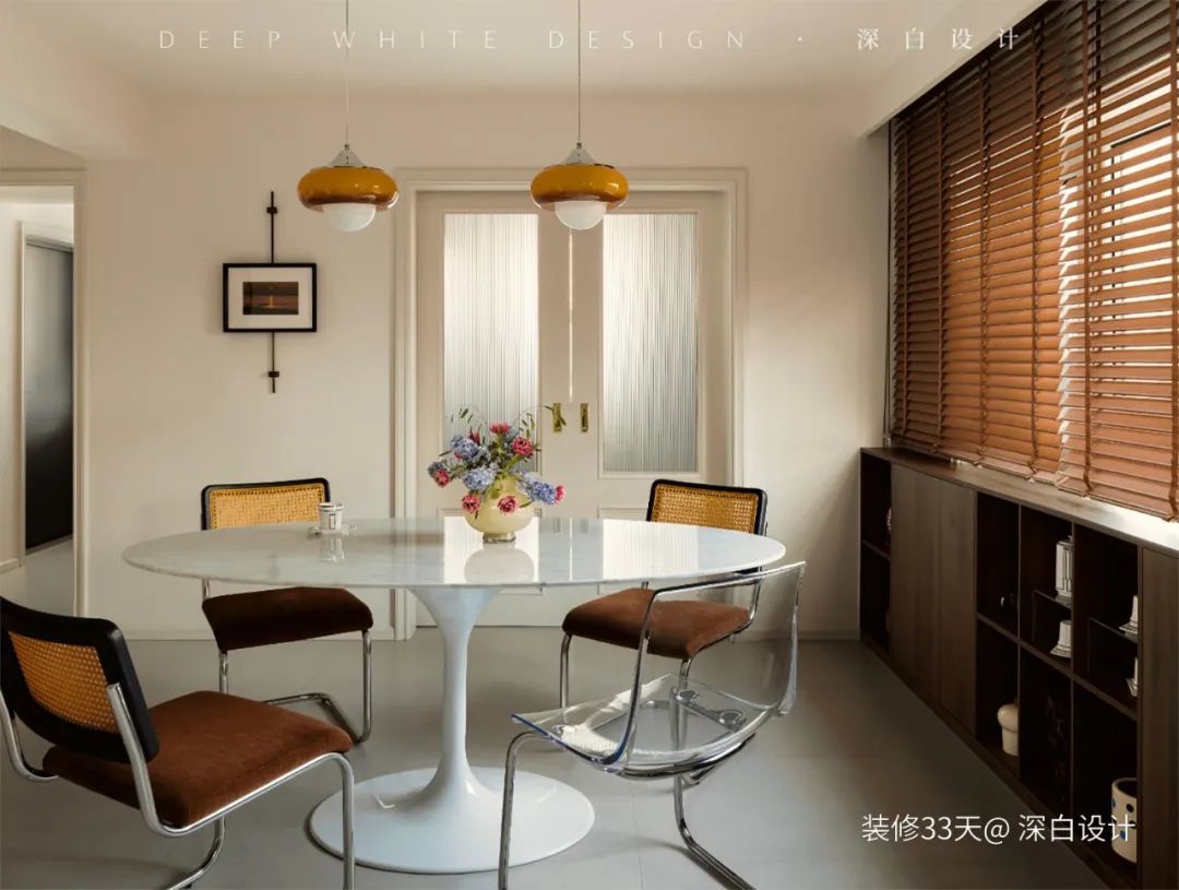 ▲ 餐厅以一张白色圆形餐桌为中心,搭配藤编餐椅,不仅舒适实用,同时也向空间注入了一股轻松而略带复古的风情。沿窗同样定制一排矮柜补充收纳