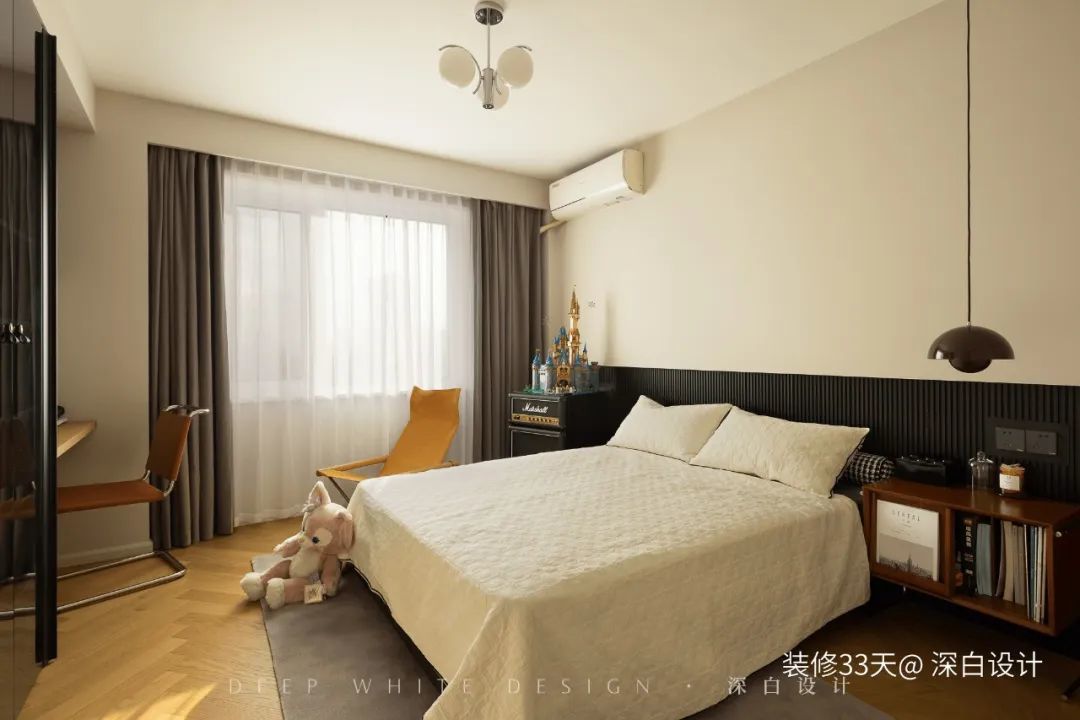 ▲ 次卧,黑色格栅作为床头的设计元素,不仅为房间增添了一种复古的浓厚感觉,还与深色实木的床头柜形成了完美的搭配,一同营造出一个温馨而有格调的休息环境